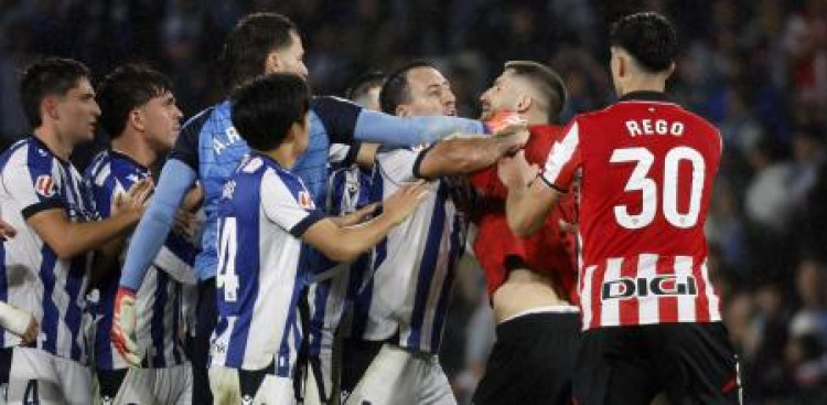 El derbi entre la Real Sociedad y el Athletic terminó con una tangana tras el pitido final. Todo comenzó con un forcejeo entre Aramburu y Oihan Sancet en el centro del campo, que rápidamente encendió los ánimos y provocó un encontronazo entre varios jugadores de ambos equipos. En pocos segundos, buena parte de las plantillas se vieron implicadas en un revuelo general, con empujones, reproches y varios futbolistas tratando de separar a los más encendidos.