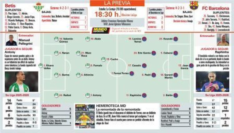 En el Barça tienen bien presente los precedentes del curso pasado contra el Betis, que puso las cosas muy complicadas a los culés. En el Benito Villamarín empataron (2-2), día en que el Flick sufrió la primera expulsión de su carrera, y en Montjuïc sacaron otro punto de valor (1-1). Dos partidos en los que Pellegrini dispuso bien sus armas para hacer daño y logró sus frutos. De cara a la visita de hoy del Barça, el técnico verdiblanco tendrá las bajas sensibles de Isco, Amrabat y el exazulgrana Bellerín, pero tendrá a disposición a Antony y Lo Celso para buscar otro resultado positivo ante los culés. Los dos habilidosos futbolistas trabajaron sin aparentes problemas y podrían salir en el once inicial bético.