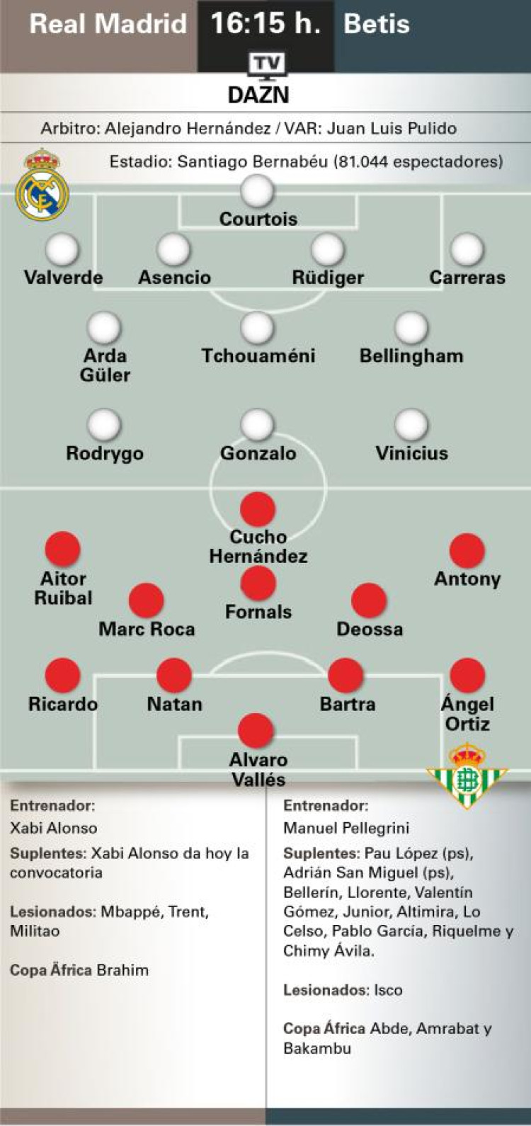 MDEl Betis, por su parte, no puede contar con su estrella, Isco, lesionado y tampoco con Amrabat, Abde y Bakambu, en la Copa África. Todo apunta que Pellegrini pondrá el mismo once que goleó al Getafe por 4-0. El equipo andaluz llega al Bernabéu dispuesto a prolongar la buena racha con la que finalizó 2025. El Betis está en puestos europeos, pero quiere luchar por entrar en Champions y un triunfo en Chamartín sería un espaldarazo a sus aspiracione