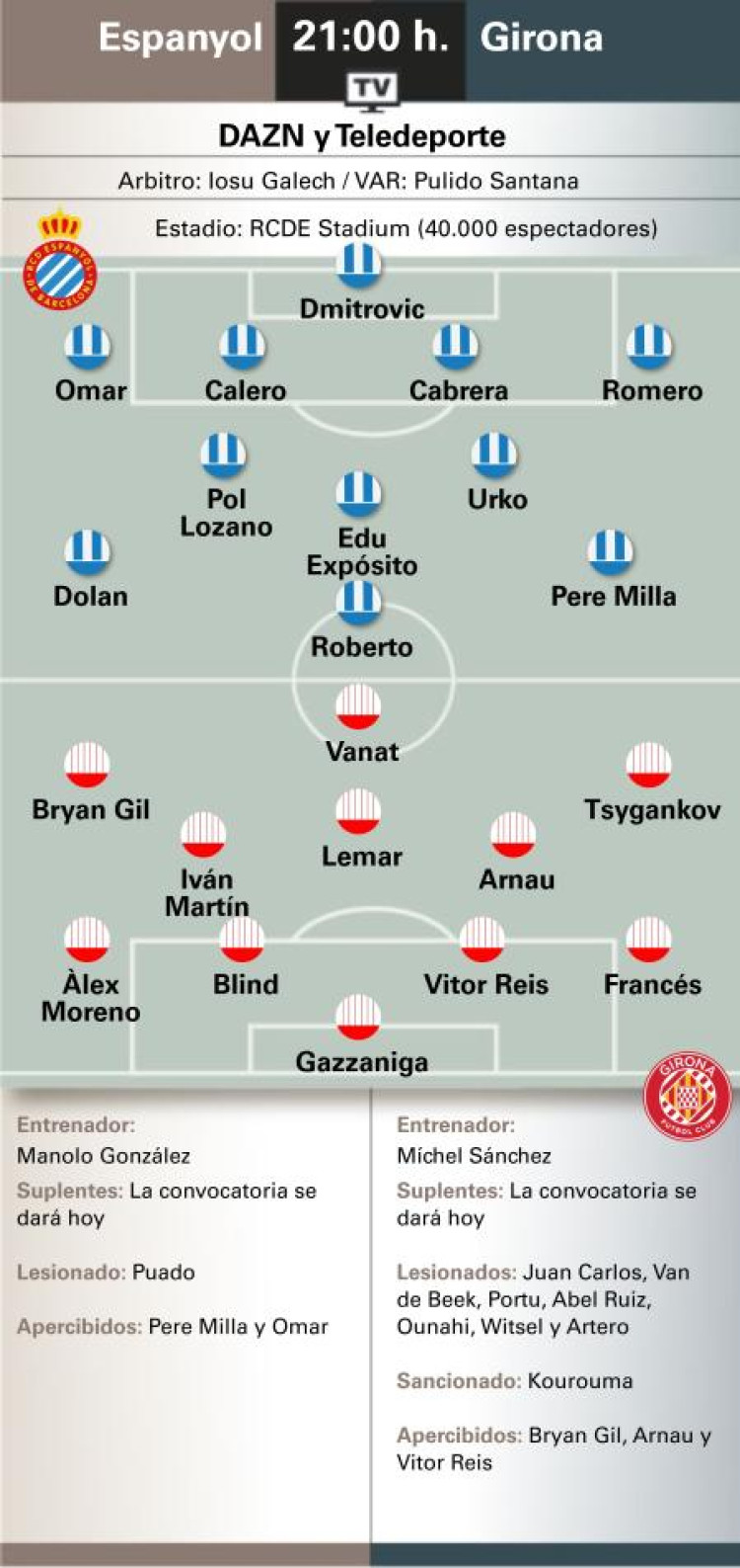 Al margen del fichaje invernal, Míchel, salvo sorpresa, repetiría el equipo que ganó al Mallorca, siendo seria duda Witsel. La dupla ucraniana Vanat/Tsygankov (los últimos 5 goles del Girona se los reparten) es la principal amenaza para el cuadro perico de un Girona que quiere volver a hacerle un roto al Espanyol. Partidazo el que hoy se disfrutará en Cornellà-El Prat.