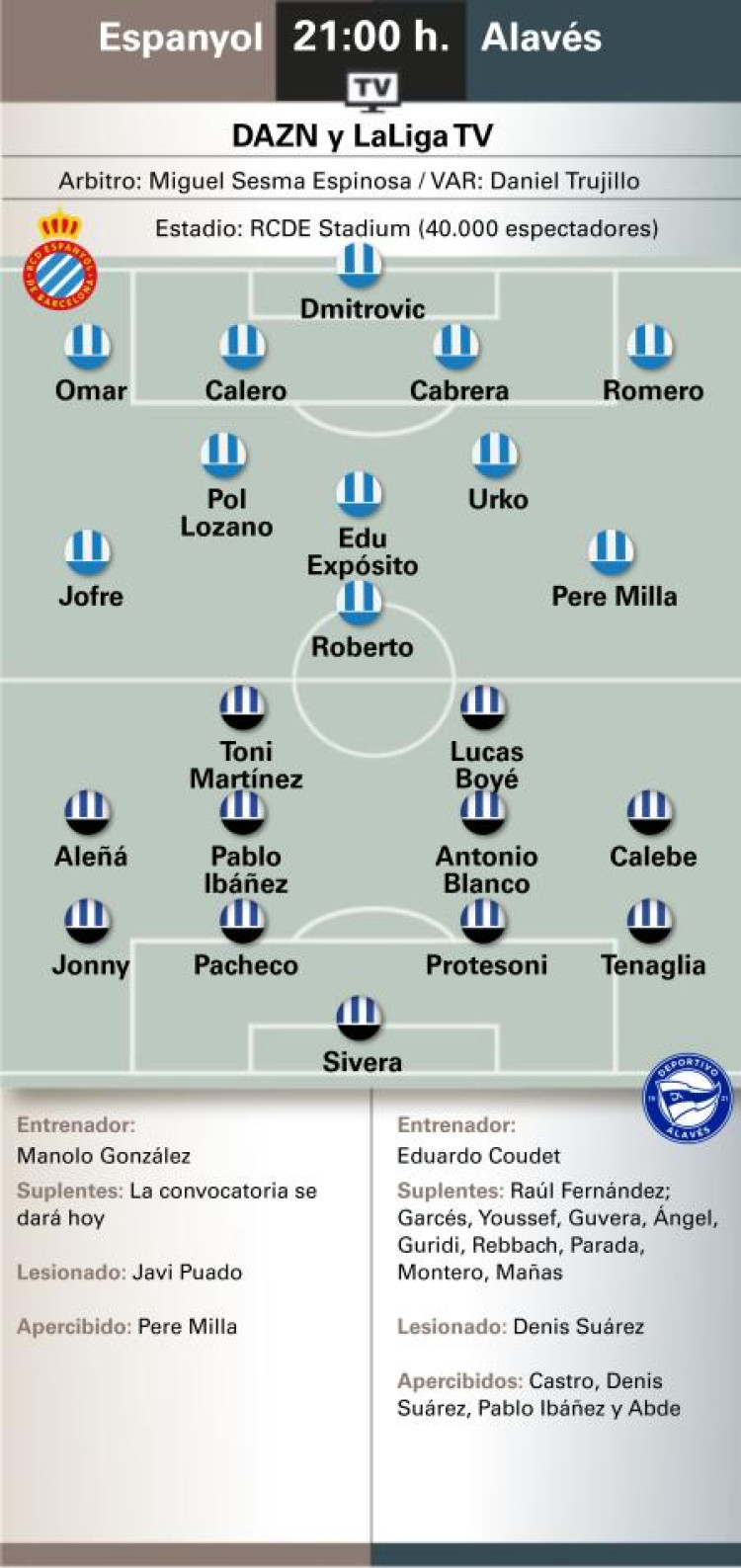 Será el primer partido tras el traspaso de Carlos Vicente, por lo que Calebe apunta a ser el extremo diestro. Ha viajado Facundo Garcés 4 meses después de su sanción. El Alavés necesita empezar a rascar fuera para poner tierra de por medio con el infierno. Pero el Espanyol no puede regalar hoy.