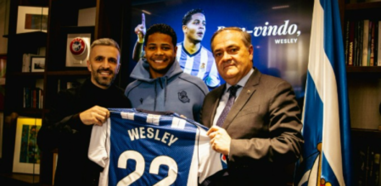 Wesley llega a la Real tras un proceso rápido y cuidadosamente planificado. El futbolista aterrizó en Donostia, pasó los controles médicos sin ningún contratiempo y firmó su contrato en las oficinas de Anoeta junto al presidente Jokin Aperribay y el director deportivo Erik Bretos. El acuerdo queda así cerrado en todos sus términos y el brasileño se incorpora a la plantilla realista para lo que resta de temporada.