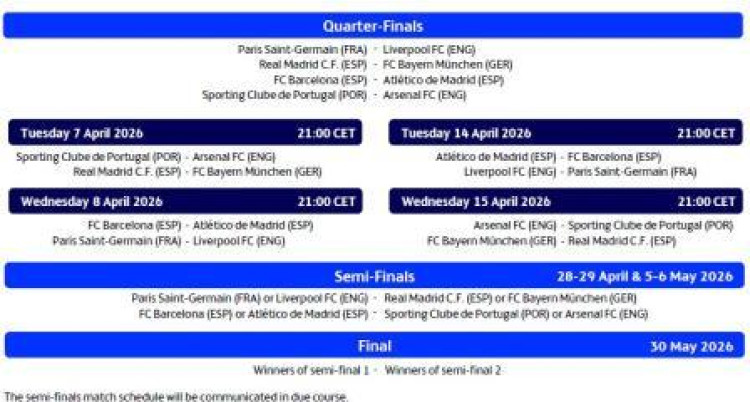Ya se conocen las fechas de la apasionante eliminatoria de cuartos de final de la Champions entre el Real Madrid y el Bayern. El conjunto merengue disputará la ida en el Santiago Bernabéu, el martes 7 de abril, y la vuelta en Múnich, el miércoles 15 de abril, ambos a las 21.00 horas. El vencedor de este duelo se medirá en semifinales al ganador del cruce entre el Paris Saint-Germain y el Liverpool.