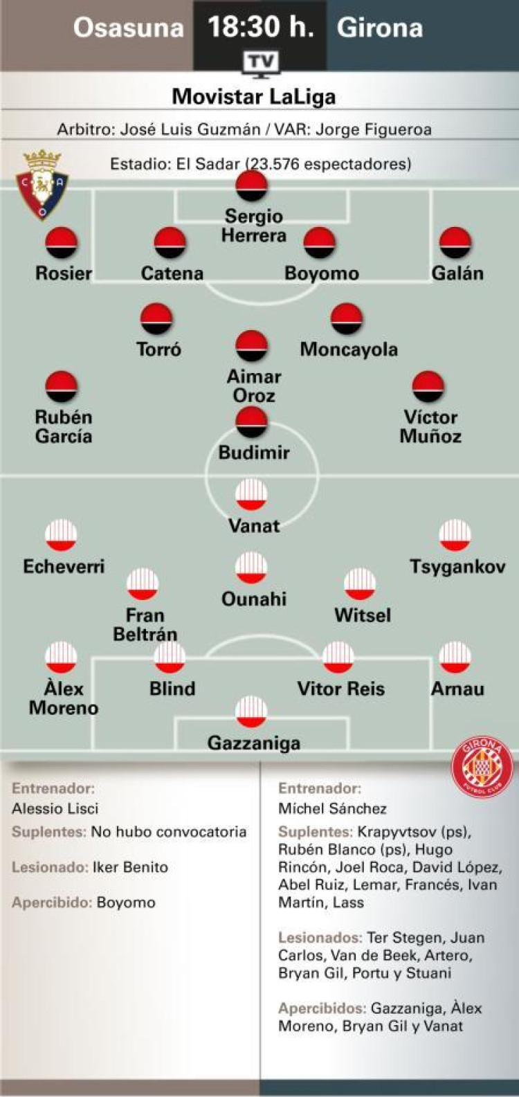 En la ida, el conjunto de Míchel logró imponerse por la mínima (1-0) en Montilivi, en un partido ya marcado por la igualdad y la exigencia física. El precedente reciente también favorece a los catalanes, que han ganado cuatro de los últimos cinco enfrentamientos ante Osasuna, aunque cada visita a El Sadar presenta un guión distinto.