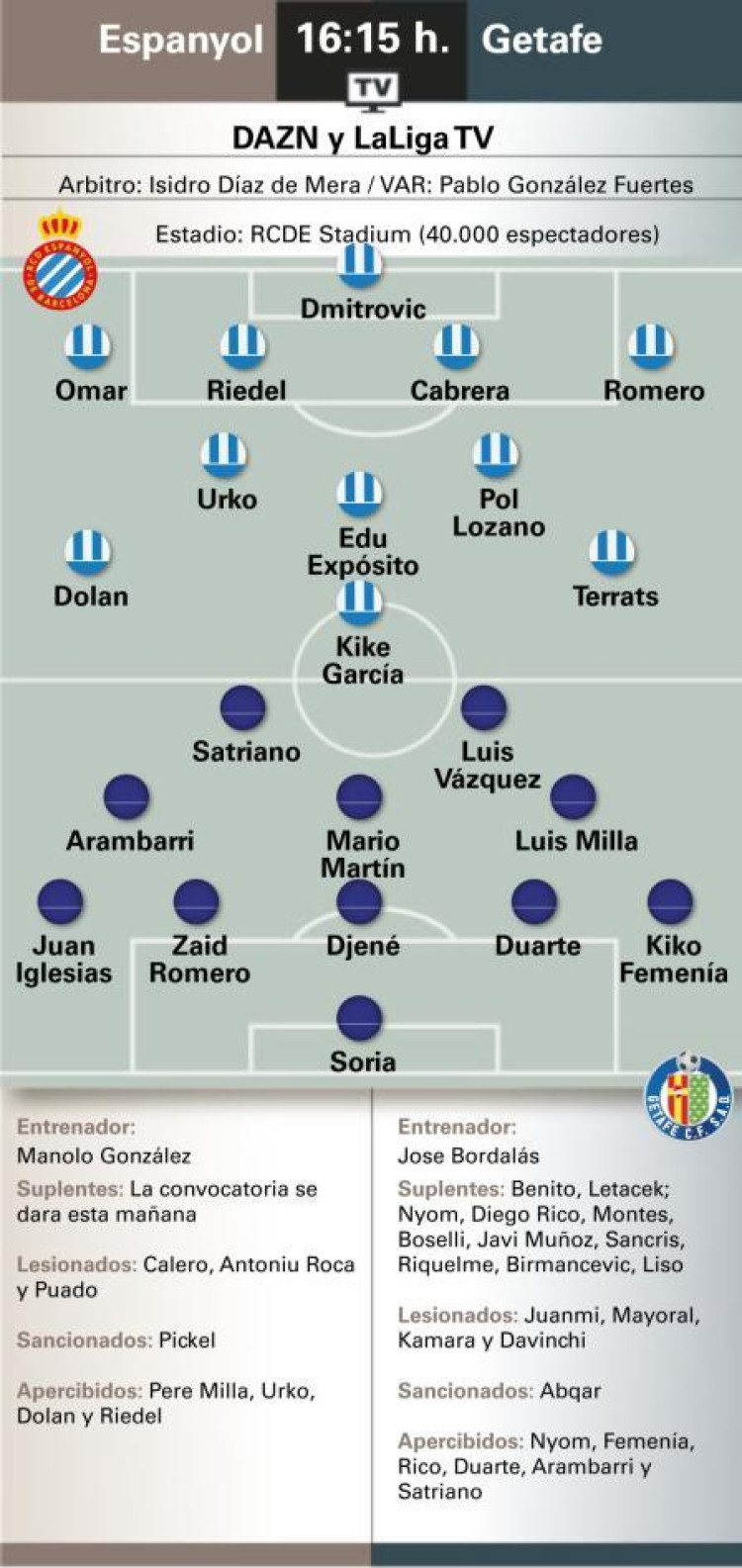 En la otra orilla estará hoy un Getafe que se ha catapultado en esta segunda vuelta, siendo ahora noveno con 35 puntos, solo dos menos que los pericos, por lo que los madrileños superarán a los catalanes caso de vencer. Los azulones llegan también calientes al duelo tras la polémica arbitral que tiñó su partido ante el Atlético de la anterior jornada (expulsión de Abqar).