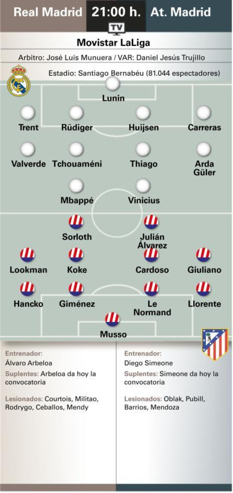 Para este derbi, Arbeloa recupera a Bellingham y Asencio, aunque los dos apuntan al banquillo. No pasa así con Carreras y tampoco con Mbappé. El francés ya jugó unos minutos ante el City en Manchester y tiene casi todos los números para ser titular ante el Atlético de Madrid. Habrá que ver cómo reacciona el equipo blanco, que gana poder goleador con Mbappé, pero puede perder su solidez defensiva, clave en los últimos triunfos blancos, como los dos ante el City en Champions. El resto del once, el habitual de los últimos choques, con las novedades de Lunin, Carreras y Mbappé.