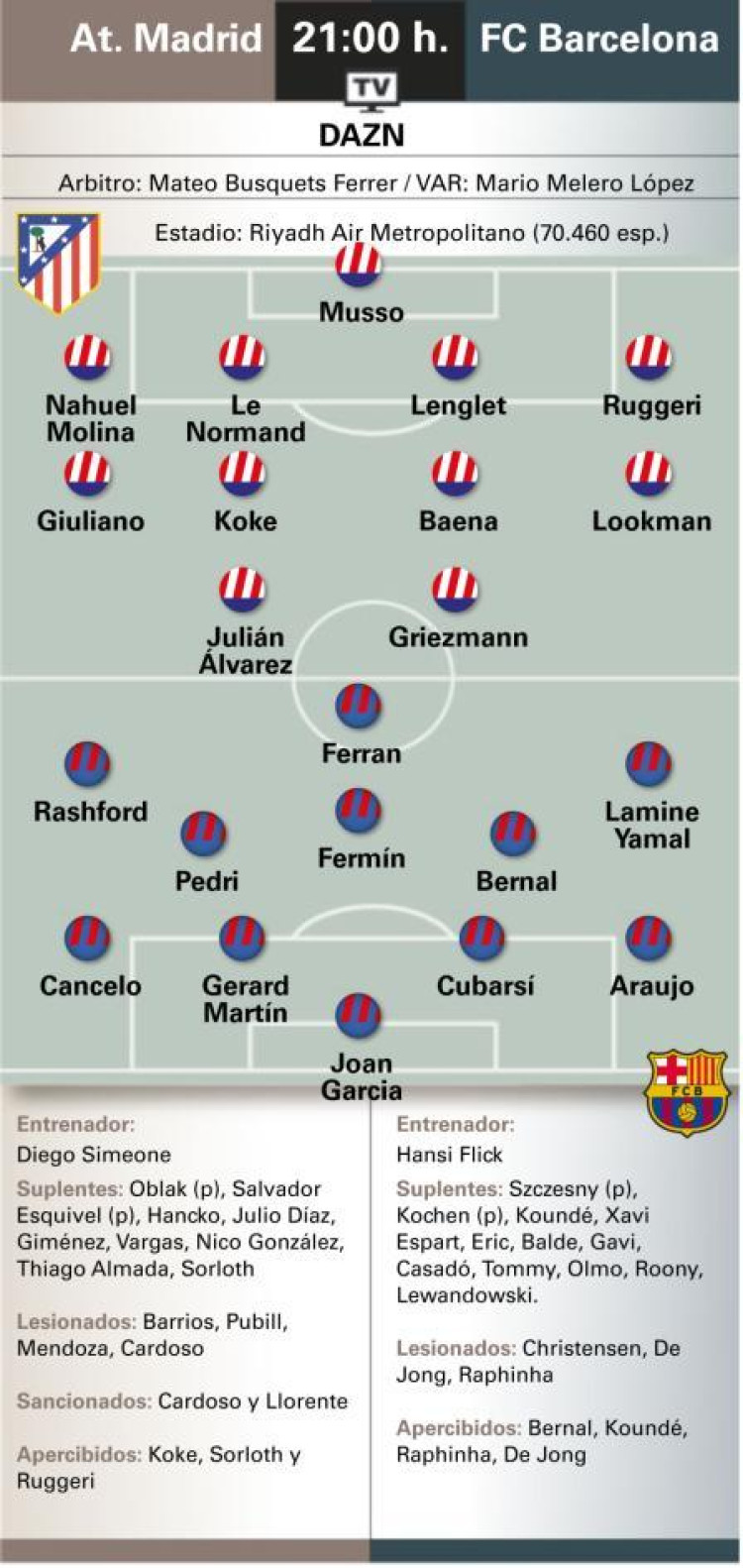 El doble pivote parece claro con la dupla de Marc Bernal y Pedri, mientras que Lamine Yamal y Fermín, ya sea como mediapunta o extremo zurdo, son piezas casi indiscutibles para Flick. En punta, Ferran podría repetir titularidad ante el Atleti por delante de Lewandowski. El valenciano fue el elegido en el once en los dos duelos de la eliminatoria de cuartos de Copa, aunque el polaco fue baja en la vuelta en el Spotify Camp Nou por la fractura en la cara que sufrió ante el Villarreal.