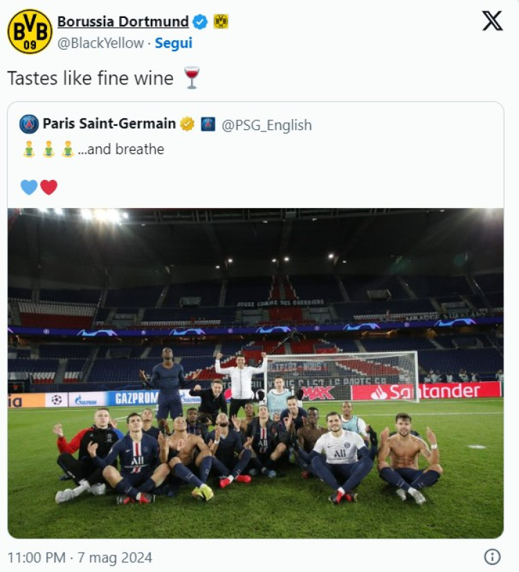 Al fischio finale si è scatenata la festa dei calciatori, del settore ospite del Parco dei Principi e dei supporter in Germania. I gialloneri hanno voluto togliersi anche un sassolino dalla scarpa: nel 2020 i parigini avevano preso in giro l’esultanza di Haaland. Adesso è il Dortmund a retwittare con una didascalia pungente: “ha il sapore del buon vino…”.