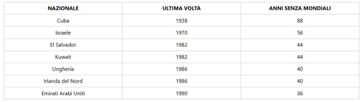 Astinenza Mondiale. Sono diverse le Nazionali che mancano da tempo nella più grande kermesse per Paesi: l'Italia, con i suoi 12 anni, è 'soltanto' 21esima a livello globale, nulla in confronto agli 88 anni di Cuba.